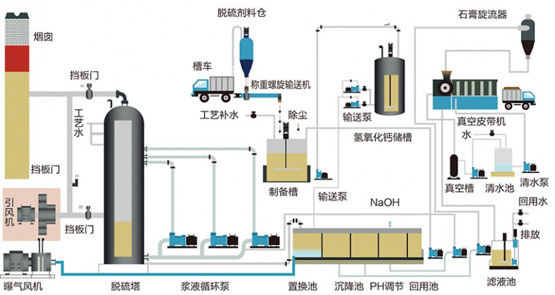 鈉-鈣雙堿法采用火堿吸收SO2  ,石灰還原再生,再生后吸收劑循環(huán)使用,無廢水排放。窯爐煙氣經(jīng)除塵器除塵后進入脫硫塔,并與脫硫液中的堿性脫硫劑在霧化區(qū)內(nèi)充分接觸反應,完成煙氣的脫硫吸收。